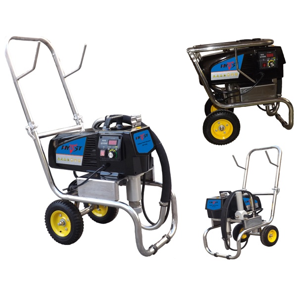 HYVSTSPT450 безвоздушный окрасочный аппарат высокого давления для распыления красок средней вязкости.Окрасочный аппарат предназначен для проведения покрасочных работ в условиях строительной площадки, его применяю для покраски стен, потолков, фасадов,покраски заборов, металлических, деревянных и бетонных конструкций. Окрасочный аппарат работает на один краскопульт, шланги от аппарата на краскораспылитель можно удлинить до 45 метров. Принцип работы безвоздушного аппарата: краска засасывается из ведра с помощью поршневого насоса с электрическим двигателем и подается под высоким давлением на краскопульт для распыления через сопло. Краска забирается непосредственно из того ведра, в котором она поставляется, переливать краску в какую-то отдельную емкость не требуется.