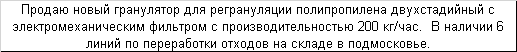 Продаю новый гранулятор для регрануляции полипропилена двухстадийный с электромеханическим фильтром с производительностью 200 кг/час. В наличии 6 линий по переработки отходов на складе в подмосковье.