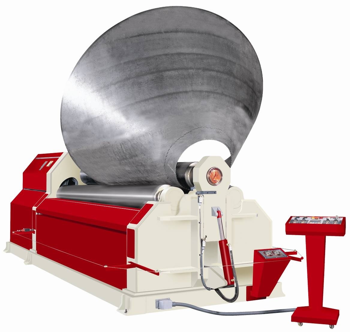 - Машина в стандартном исполнении полностью готова к гибке конусов, у большинства конкурентов устройство гибки конусов – опция за дополнительную оплату. Для удобства снятия готовых деталей машина обладает откидной опорой верхнего вала с гидроприводом, верхний вал приподнимается под углом (у многих конкурентов верхний вал жестко зафиксирован и не имеет гидропривода подъема).