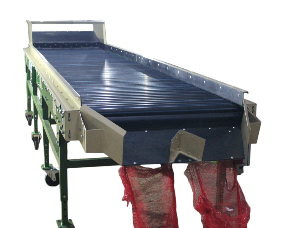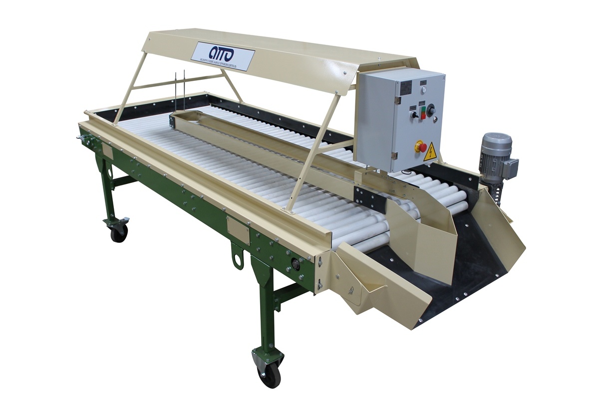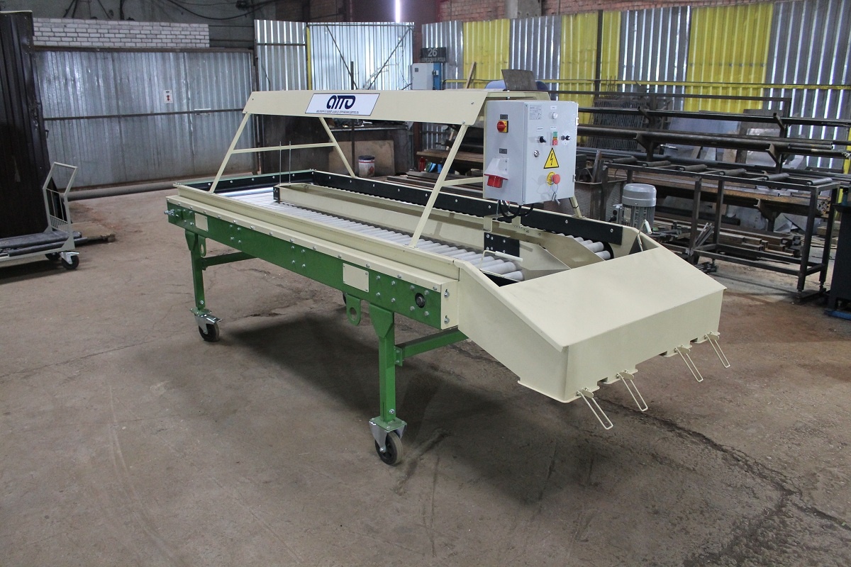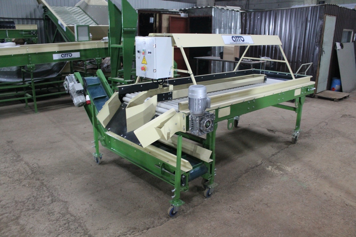 Инспекционный роликовый стол для овощей и картофеля КРИ-10 - предназначен для ручной инспекции (переборки) овощей, картофеля, лука, моркови, свеклы, фруктов, цитрусов, мандаринов, апельсинов. Некачественные (подгнившие, нестандартные, битые и т д.) овощи помещаются в разделитель, находящийся в центральной части конвейера, откуда автоматически попадают на отводящий наклонный транспортёр или в специальную тару (контейнер). Качественные овощи перемещаются далее по линии по переработки овощей или отводятся для упаковки в сетки, мешки, пакеты (сетка-держатель на 4 сетки). В зону сортировки овощи подаются автоматически с помощью вращающихся роликов. Сортировочный переборочный стол установлен на колёсных опорах (мобильный). Имеется плавная регулировка конвейера по высоте. На Сортировочном столе установлен частотный преобразователь для регулировки скорости движения роликов. Имеется освещение по желанию заказчика (входит в стоимость стола). Сортировочный стол изготавливается в двух вариантах: 1. С сетка-держателями на 4 сетки, 2. С выгрузным лотком.