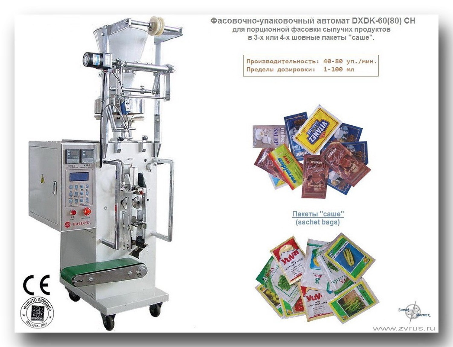 Автомат фасовочно-упаковочный DXDK-80 CH (DXDK-60 CH) предназначен для порционной фасовки и упаковки сыпучих (гранулированных) продуктов в 3-х или 4-х шовные пакеты типа "саше".