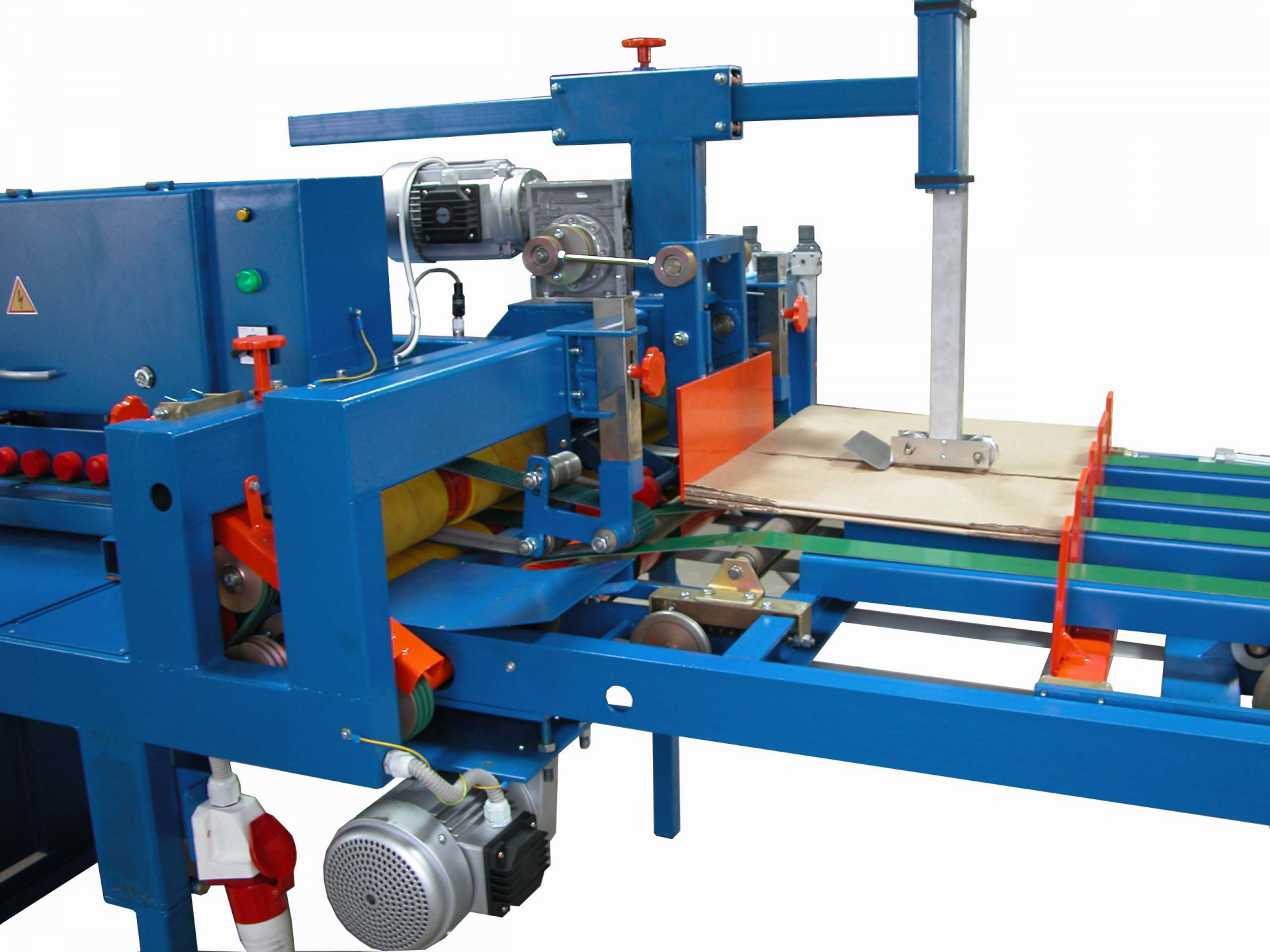 Заготовка проходит под головкой для нанесения клея и там наносится клеевая дорожка, длина которой предварительно устанавливается с помощью инфракрасных датчиков. Левая направляющая сгибает заготовки при их движении.