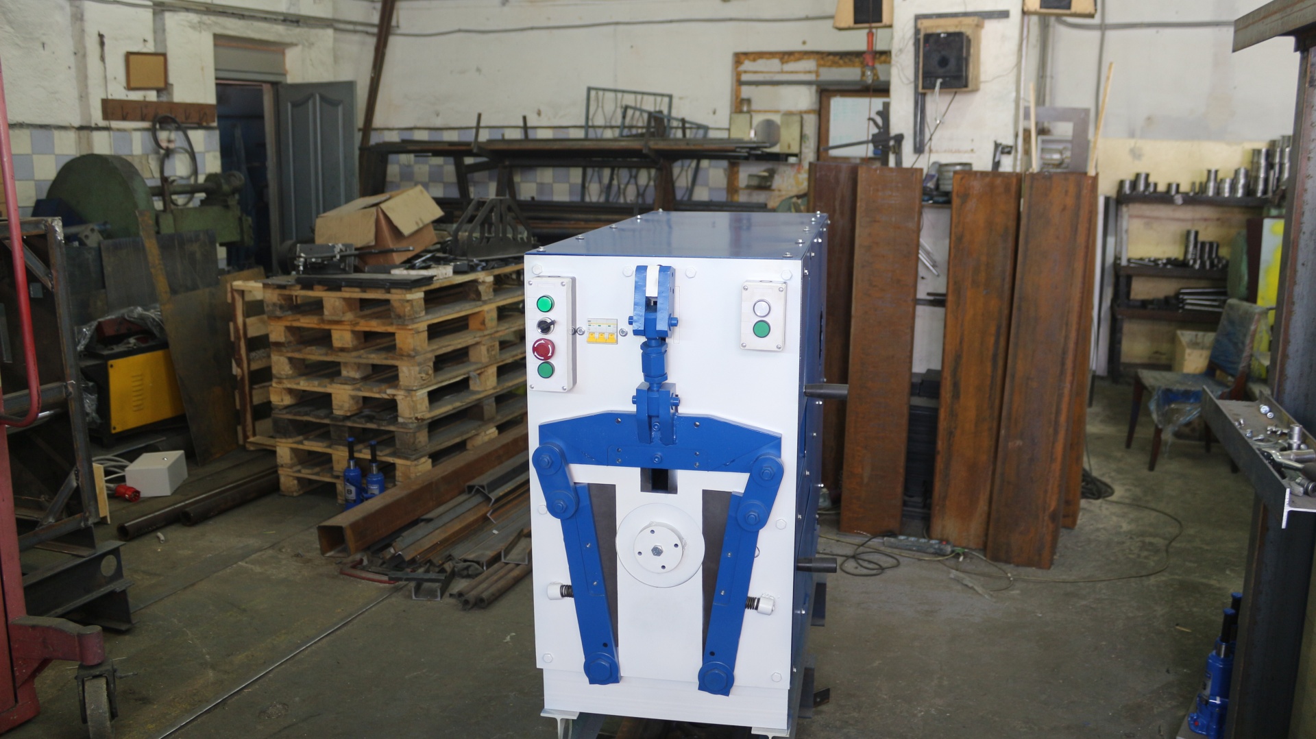 Станок выполнен из станины, на которой жестко закреплены двигатель, направляющие валы, система рычагов на лицевой стороне и механизм подачи (рычаг-рейка). При включении электродвигателя, вращение передается на эксцентрики, расположенные на валу редуктора. Внешний эксцентрик связан с системой рычагов, а внутренний толкает рейку каретки. Первым срабатывает внешний эксцентрик, передавая усилие через систему рычагов на ножи. Ножи врезаются в трубу, образуя складку.