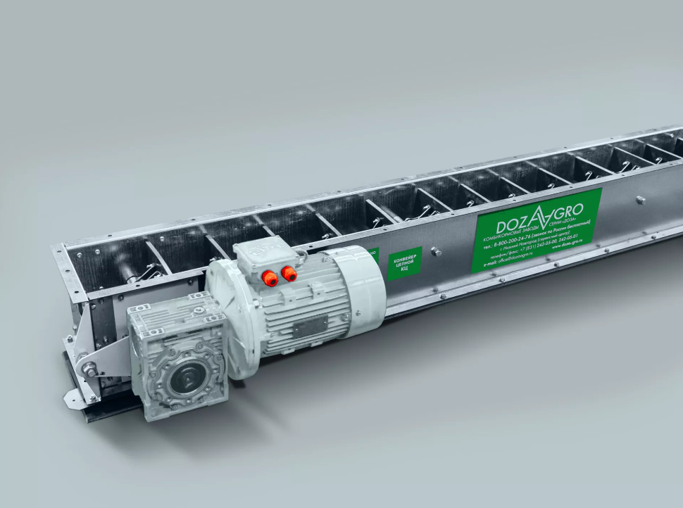 Конвейер цепной серии КЦ предназначен для транспортировки сыпучих материалов и других продуктов влажностью до 14% в горизонтальном направлении. Продукт поступает в загрузочную секцию транспортера, затем движущиеся скребки перемещают его на противоположный конец конвейера, где происходит сброс продукта в выгрузное окно.