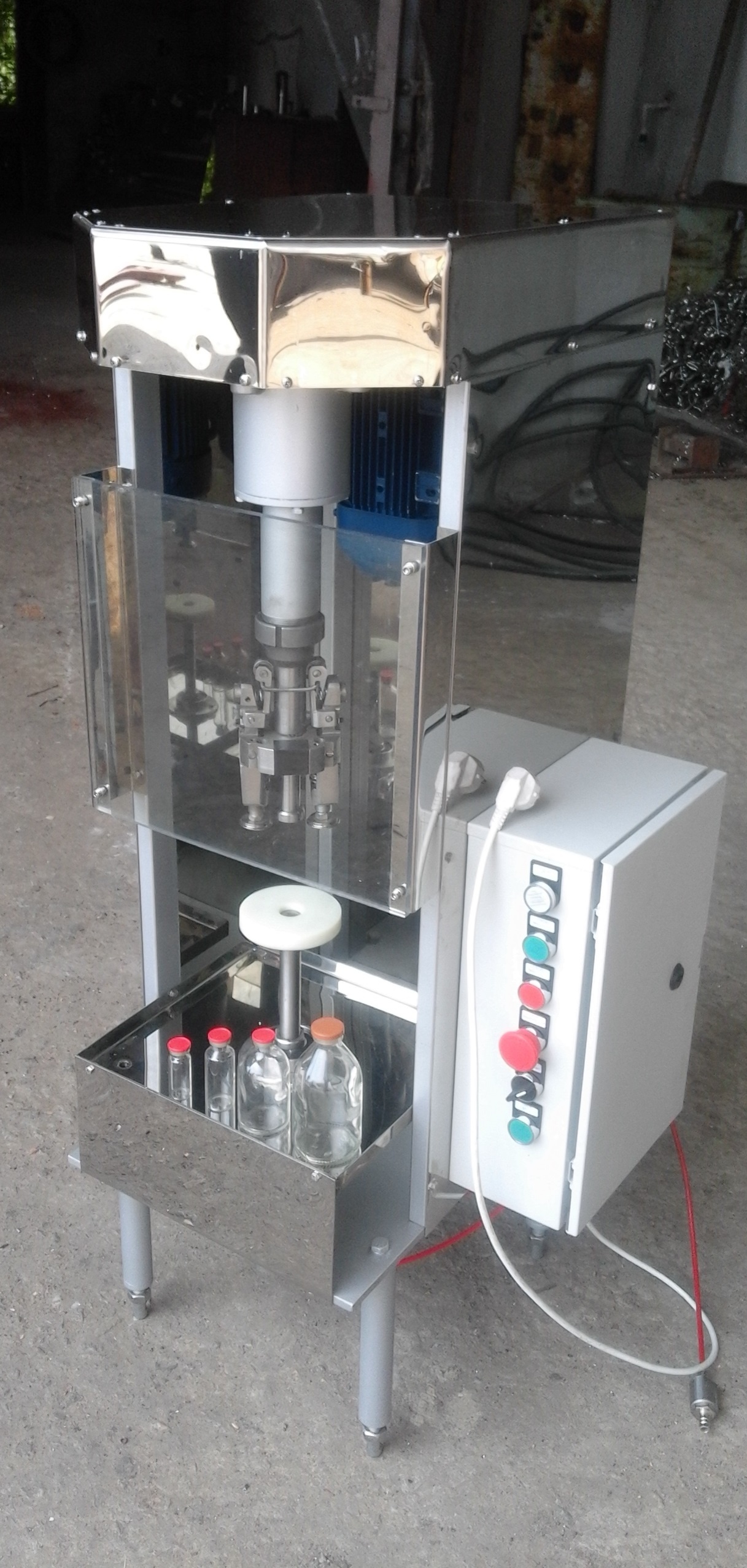 Продается полуавтоматический укупорочный станок. Предназначен для закатывания или укупоривания медицинского флакона алюминиевой пробкой, водочной бутылки улюминиевой пробкой, путем прижимания колпачка и подкатки пояска по контуру бутылки. Укупоривания пэт бутылок пластиковыми колпачками. Возможность подобрать функциональность по желанию клиента.