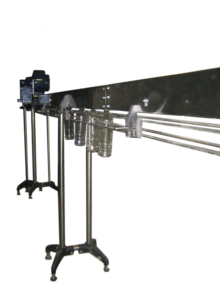 Предназначен для транспортировки ПЭТ-бутылок. Бутылки подвешиваются за фланец шейки и продвигаются с помощью потока воздуха по направляющей. Транспортер воздушный применяется в линиях розлива, как соединяющий элемент между выдувом и розливом.