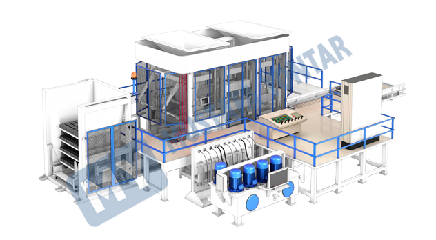 Основной отличительной чертой данной модели, дающей важные преимущества, является способ формования. Процесс формования происходит не на технологическом поддоне, а на специальном металлическом столе и уже затем продукция помещается на технологический поддон.