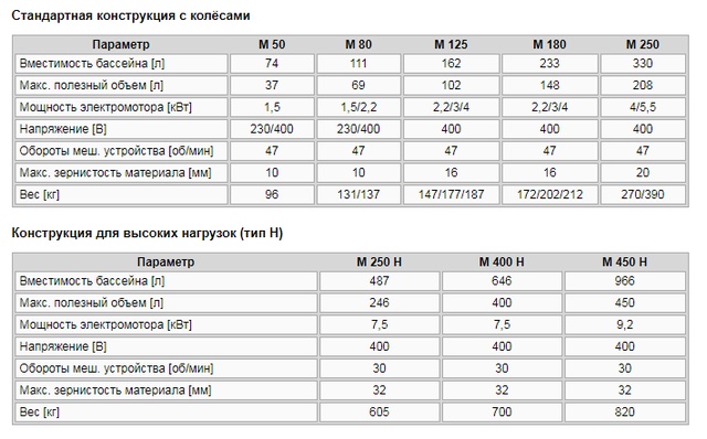 Ёмкость мешального бассейна неподвижно соединена со стойкой, которая может быть у моделей M 50 – M 250 оснащена ходовыми колесами. Модели M 50 – M 180 оснащены подпорками, регулируемыми по высоте и позволяющими менять высоту сброса смеси.