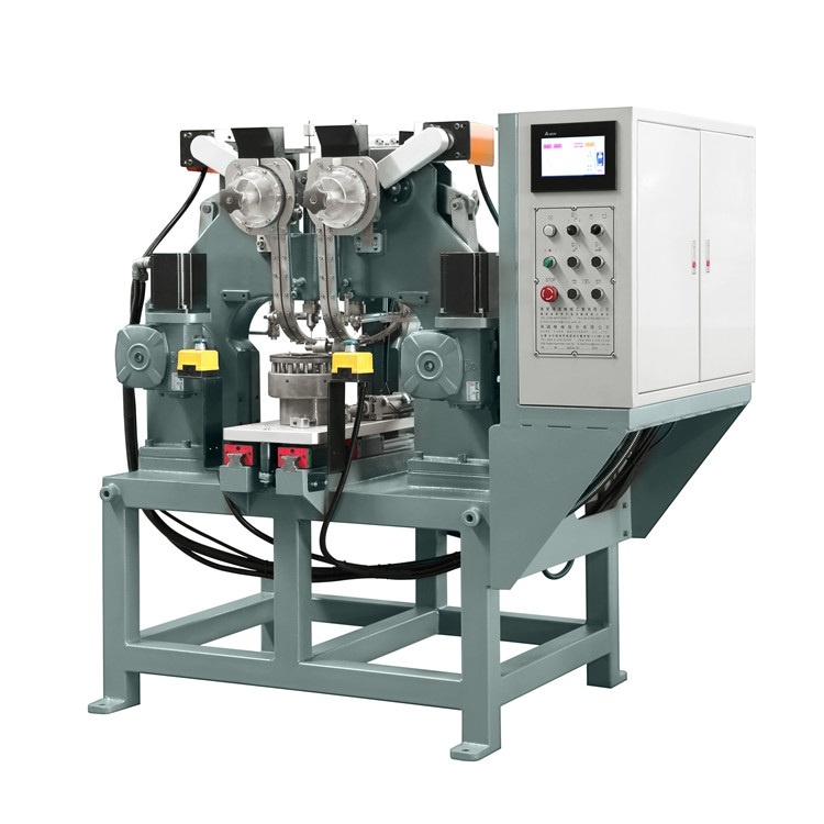Клепальный станок для тормозных накладок HC-R3E сформирован на прочной сварной станине. Заклепки поступают в операционную зону по двум вертикальным магазинам одновременно. Дорожки вместе с принимающими барабанами приводятся во вращение с помощью обособленных сервомоторов. Для укладки и надежной фиксации элементов тормозной накладки предусмотрен специальный барабан, который вводится в операционную зону с помощью подвижной платформы. К корпусу этого барабана присоединен рычаг с пневматическим цилиндром, который необходим для незначительного проворачивания барабана для установки второй пары заклепок. Операция клепки выполняется двумя головками одновременно. Смазка узлов и механизмов делается в автоматическом режиме.