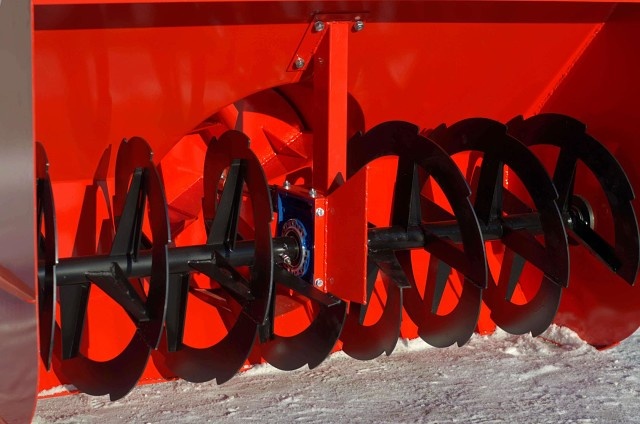 Навесное оборудование, которое часто приобретают для обслуживания коммунальных хозяйств, дорожно-транспортных служб. Оно агрегатируется с минитракторами мощностью от 14 до 25 л.с. Прекрасно справляется с удалением снежного покрова высотой до 70 см. Захват снегоочистителя достигает 1,25 м. В шнекороторном механизме шнек измельчает снежную массу и подает ее к вращающемуся ротору.
