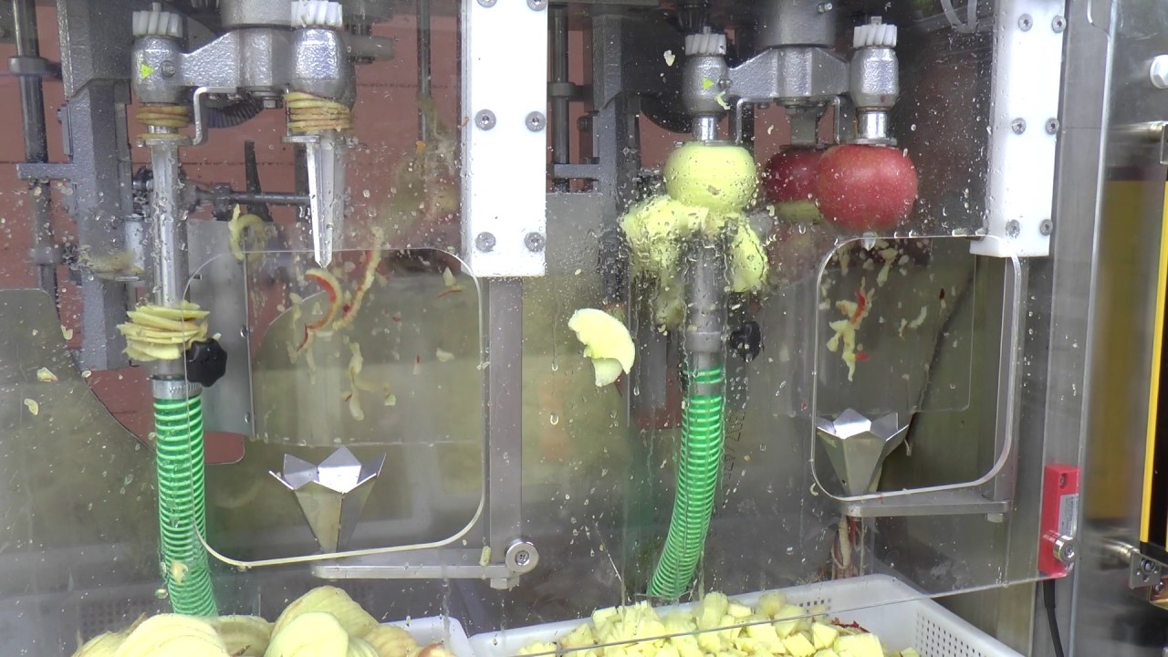 от 55 до 90 мм Ø. Она проста в эксплуатации, инструменты для нарезки, сегментации и выбора сердцевины можно легко и очень быстро заменить. Операции по обработке до 6 яблок могут проводиться одновременно. Предлагаются различные ножи и насадки для нарезки яблок на дольки, кольца и кубики. Простое обслуживание, безопасность труда за счет установленного кожуха.