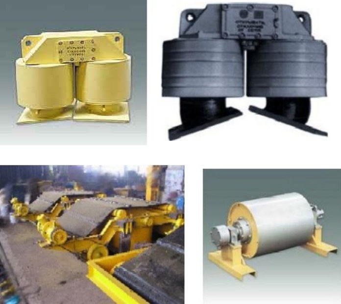 Железоотделители электромагнитные подвесные (типа П-100, П-120, П-160) марок ЭЖ; ЭМЖ; ДЖ; ПЭ; ЭП; ПЭЖ, железоотделители саморазгружающиеся (типа ПС-80, ПС-120, ПС-160) марок ЭЖС; ЭМЖС; ПЭС; ЭПС; ДЖС; ПСЭЖ, железоотделители шкивные (магнитный шкив, барабан типа Ш 65-63, Ш 100-80, Ш 120-80) марок ЭМШ; ЭШ; ПМШ, металлоуловители, железоуловители... Железоотделители во взрывозащищенном исполнении и на постоянных магнитах. Шкафы управления (преобразователи напряжения) железоотделителями.