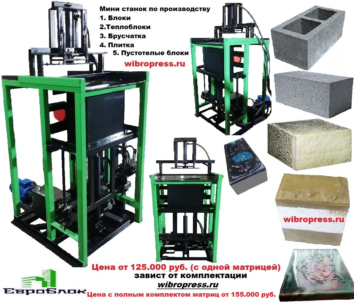 Компания ООО «Евроблок» предлагает оборудование (мини – станок на гидравлике с электроникой ( шкаф управления )) по производству теплоблоков ( любой толщиной ), также можно производить пустотелые блоки, пескоблоки, арбоблоки, керамзитные флоки, заборные блоки, перегородочные блоки, брусчатку, обливочные блоки и т.д. При пр-ве Евроблоков применяются стандартные сыпучие материалы для бетонов с добавлением цемента, а облицовка блока имеет вид мрамора. Дома из теплоэффетивных Евроблоков имеют свойства термоса. Зимой тепло не выпускает с дома, а летом в жару в доме прохладно. затраты на отопление в 3-3.5 раза меньше, чем в кирпичных домах, например, для отопления дома общей площадью 200 кв. м требуется котел мощностью всего 24 кВт. Вы экономите на утепление и фасаде дома. Строительство домов из теплоэффективных Евроблоков занимает от 30-40 дней. Экономичность готовых блоков, и высокая скорость возведения зданий.