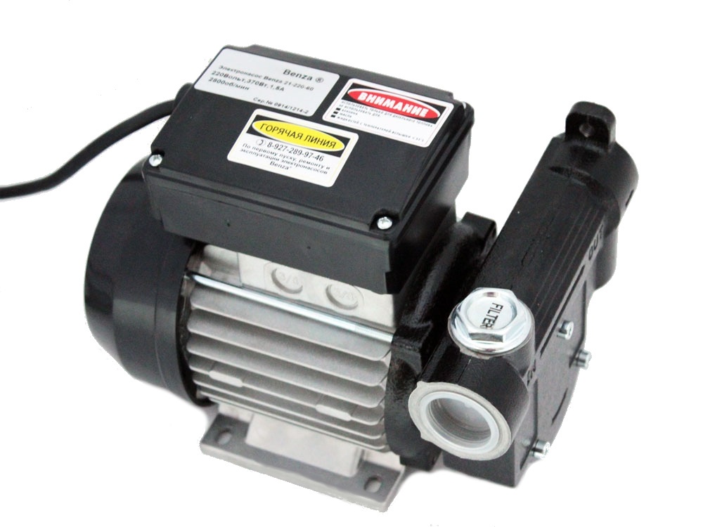 Мобильный электронасос Benza 21 используется для перекачки дизтоплива, работает от источника питания 220 В. Это позволяет осуществлять заправку транспортных средств дизельным топливом, в любом удаленном от города месте. Производительность насоса, в зависимости от модели, варьируется от 50 до 150 литров в минуту, мощность от 240 до 350 Вт. Конструкция насосов для перекачки солярки включает в себя керамические уплотнения, лопатки, а также простые торцевые уплотнения.