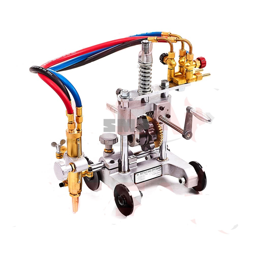 Газорезательная машина Handypipe имеет изменяемый угол наклона сопла и позволяет снимать фаску с краев. В портативной газокислородной резке с ручным управлением для труб. используется цепь и система зубчатой передачи. Приводная цепь содержит надежно сцепленные звенья, которые могут быть добавлены или убраны в зависимости от диаметра трубы. Кольцо с делениями для скашивания кромок позволяет точно настроить параметры скашивания. Клапаны для горючего газа, преднагревающего и режущего кислорода расположены вдали от нагревающихся элементов, но в пределах удобства доступа для оператора.