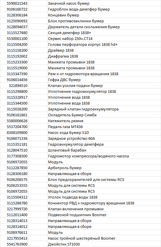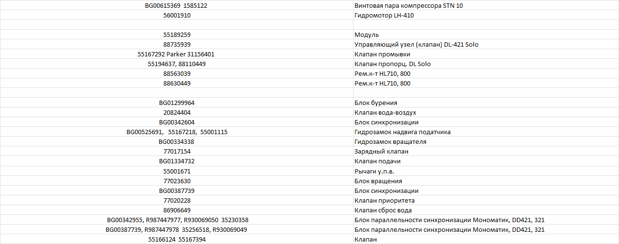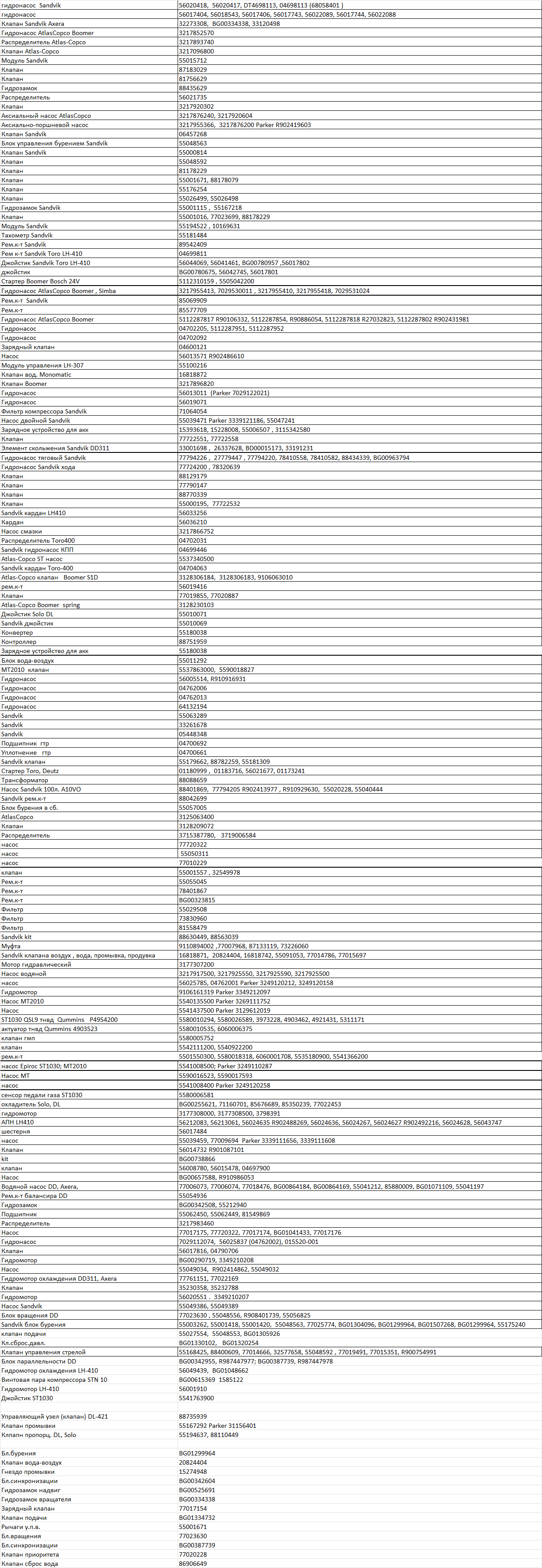 | Наименование | № по каталогу Epiroc, Atlas-Copco, Sandvik, Normet, Paus | ||||||||||||||||||||||||||||||||||||||||||||||||||||||||||||||||||||||||||||||||||||||||||||||||||||||||||||||||||||||||||||||||||||||||||||||||||||||||||||||||||||||||||||||||||||||||||||||||||||||||||||||||||||||||||||||||||