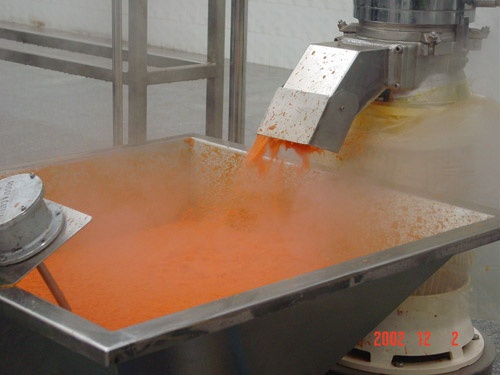 Вымытая и очищенная морковь измельчается молотковой дробилкой перед подачей на дальнейшую переработку. Степень измельчения зависит от требуемой экстракции (пюре или выжатый сок).Измельченную морковь нагревают паром в бланширователе - аппарате для размягчения волокон и получения в последующем максимального выхода сока.