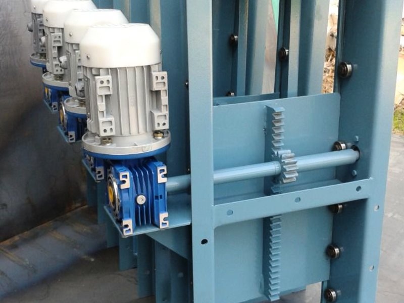 Задвижка реечная представляет собой сварной прямоугольный корпус, внутри которого по направляющим перемещается шибер. В нижней части шибера закреплена зубчатая рейка, которая сопрягается с шестерней, насаженной на приводной вал, соединенный с мотор-редуктором.