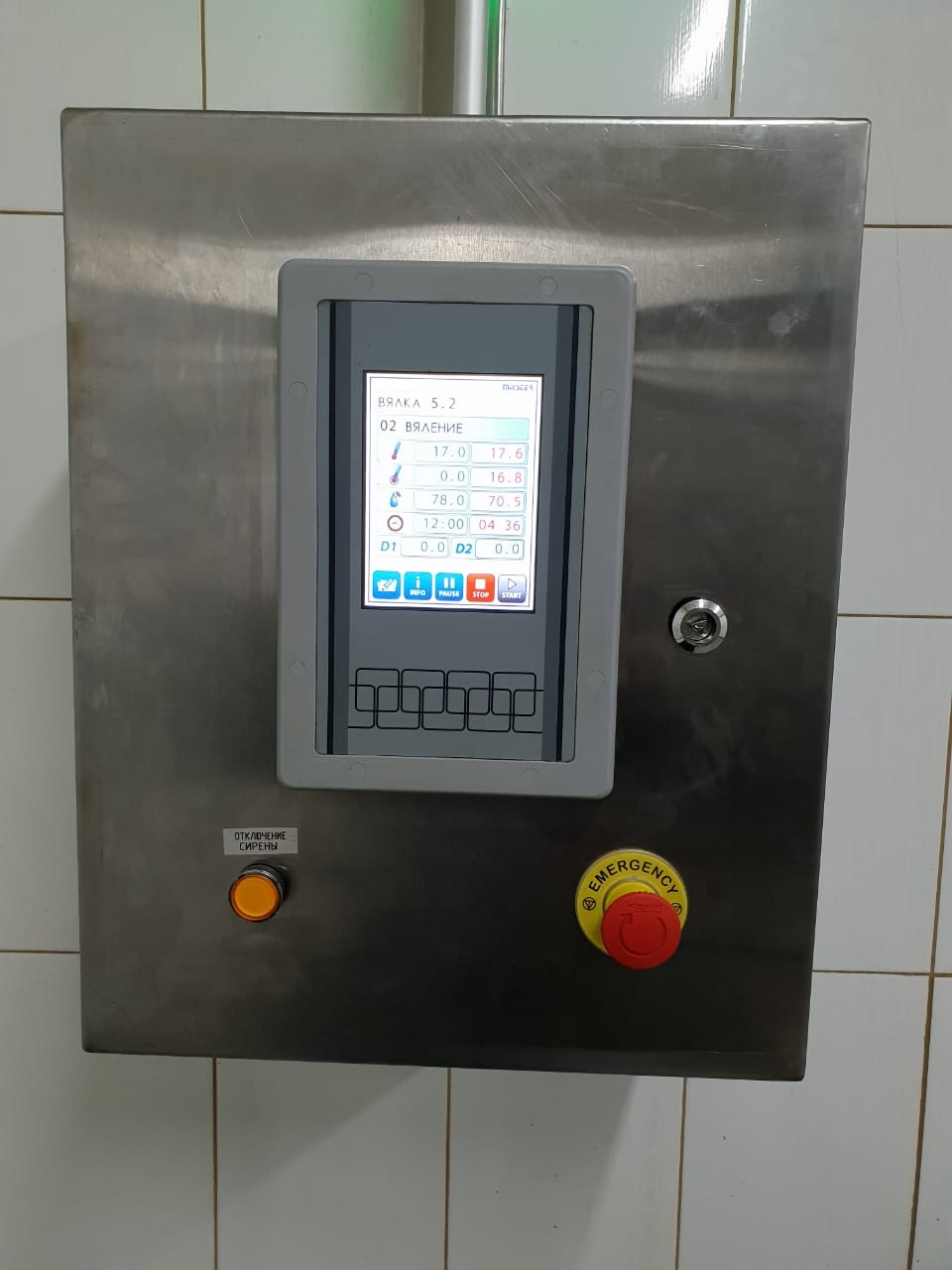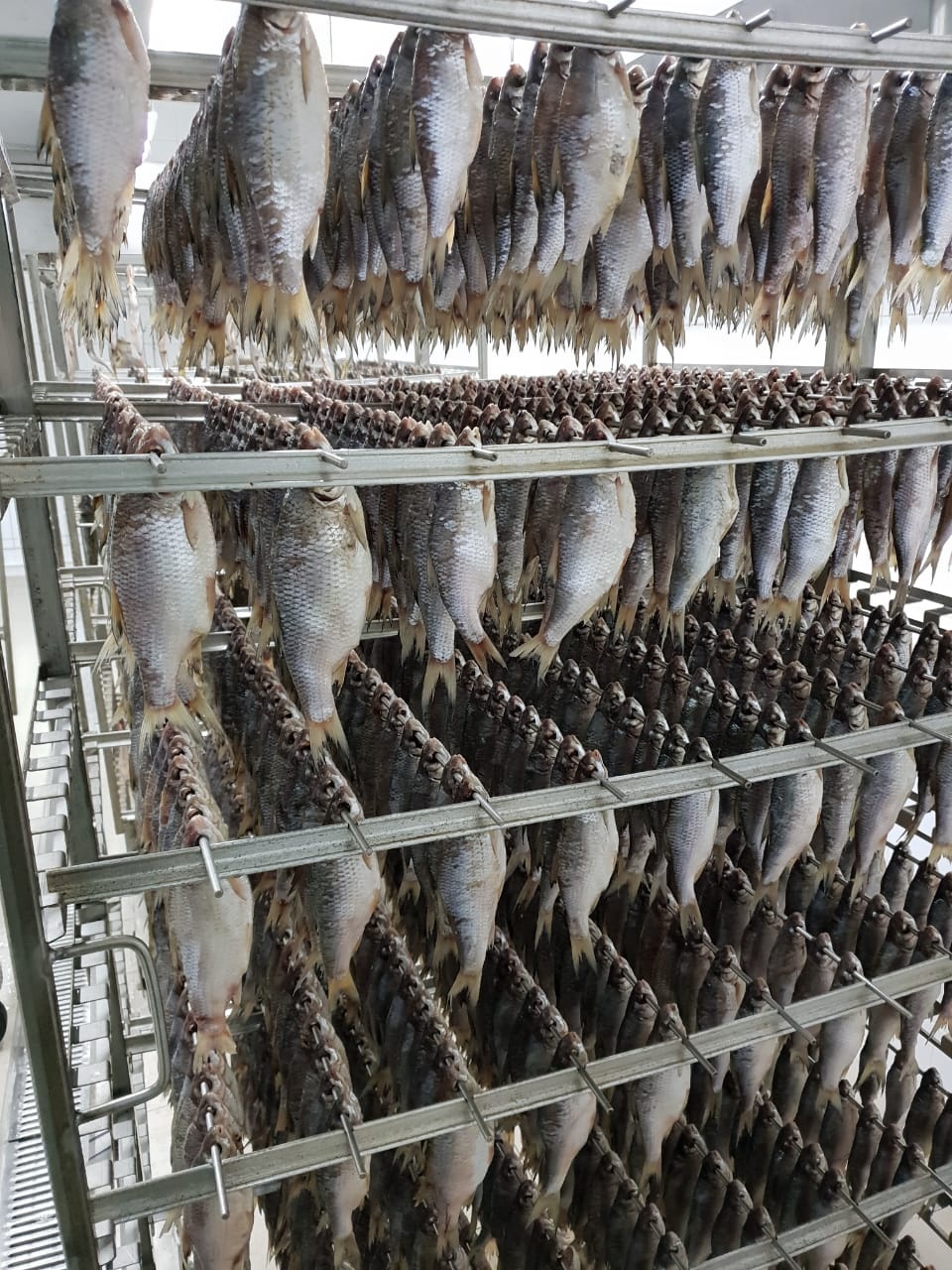 Процессы сушки и вяления происходят в цикличном режиме – «обдув-пауза» по заданным параметрам температуры и влажности в камере. Благодаря этому, удаление влаги из глубоких слоев рыбы происходит более равномерно, снижая к минимуму появления «закала» на поверхности продукции.