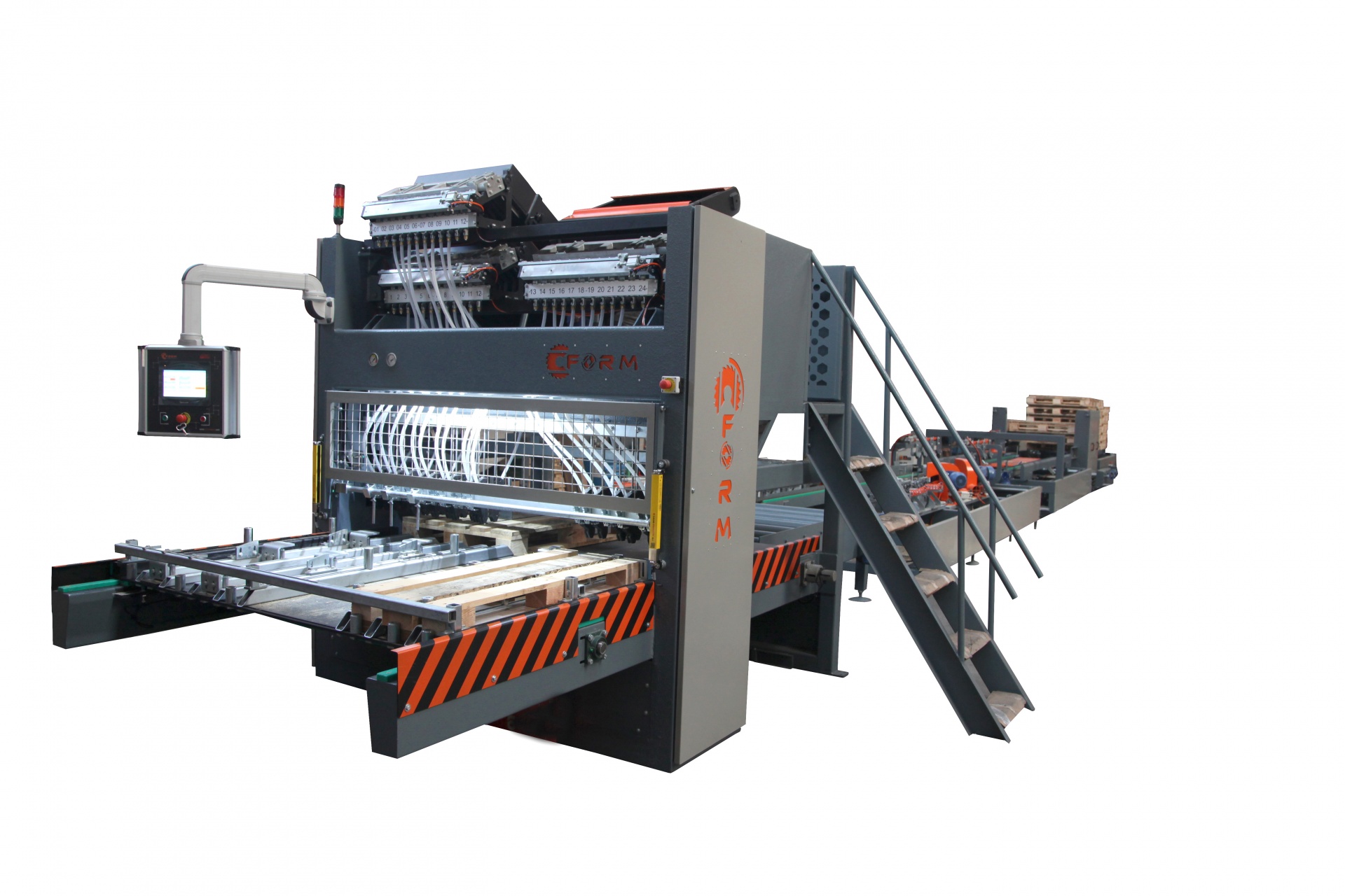 Общая мощность: 10,45 кВт (4x2,2 кВт, 3x0,55 кВт). Включено 4 шт. дисковых пил Ø250мм.