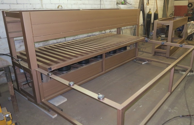 Плиты 2720*1020 мм. Шесть пневмо цилиндров. Загрузка с передней стороны пресса. Возможно изготовление данного пресса с плитой другого размера. Возможно изготовление пресса с выкатным нижним столом.