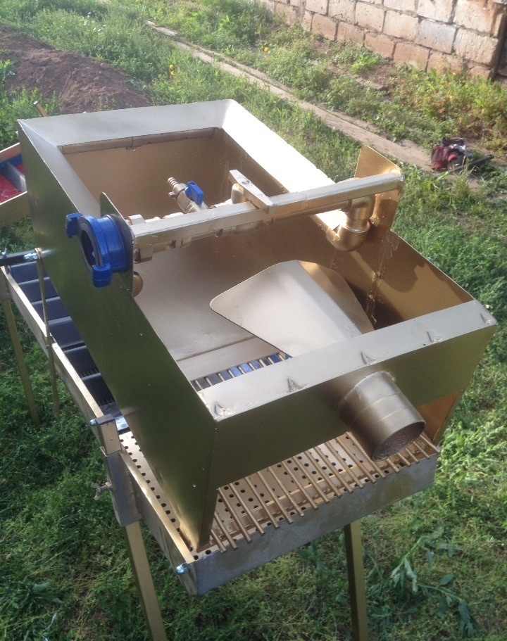 Мини драга 4К пром прибор делится на 2 прибора, может служить как полноценный прибор для объёмных работ и по отдельности. Вторую часть прибора можно использовать как разведочный шлюз на потоке рек и ключей. Мини драга имеет вывод в бункере под эжектор.