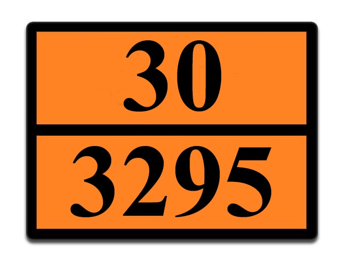 Данная табличка опасных грузов имеет маркировку 30-3295 что соответствует обозначению дистиллята газового конденсата. Оранжевая табличка опасных грузов имеет два вида обозначений. Верхняя строчка указывает на идентификационный номер опасности. Нижняя строчка содержит номер ООН.