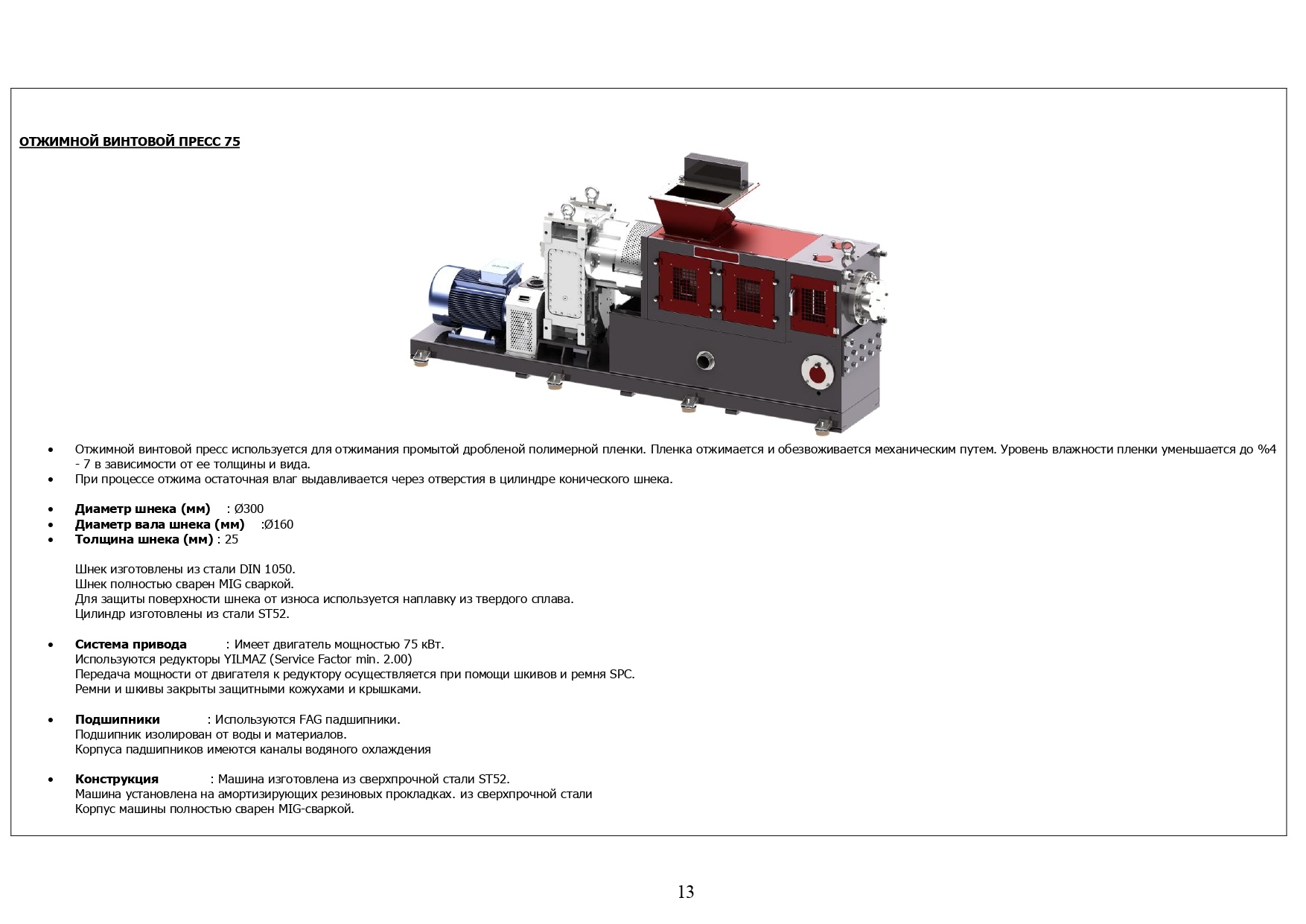 · Отжимной винтовой пресс используется для отжимания промытой дробленой полимерной пленки. Пленка отжимается и обезвоживается механическим путем. Уровень влажности пленки уменьшается до %4 - 7 в зависимости от ее толщины и вида.