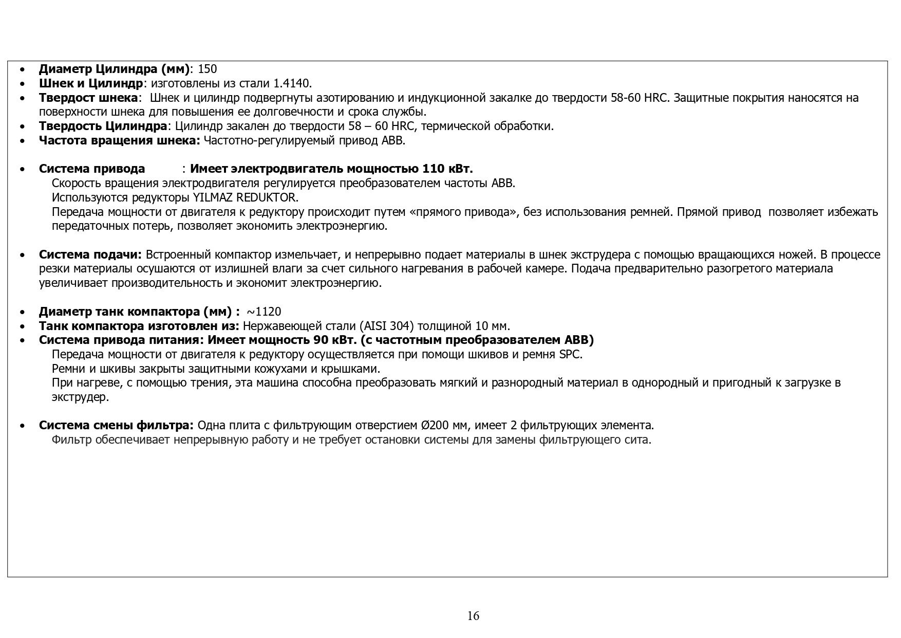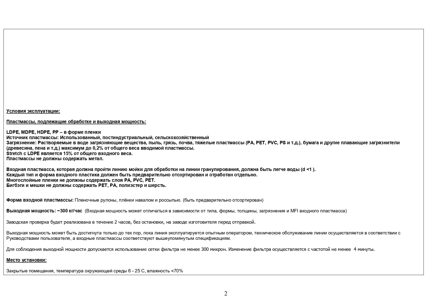 Выходная мощность: ~300-350 кг/час (Входная мощность может отличаться в зависимости от типа, формы, толщины, загрязнения и MFI входного пластмасса)