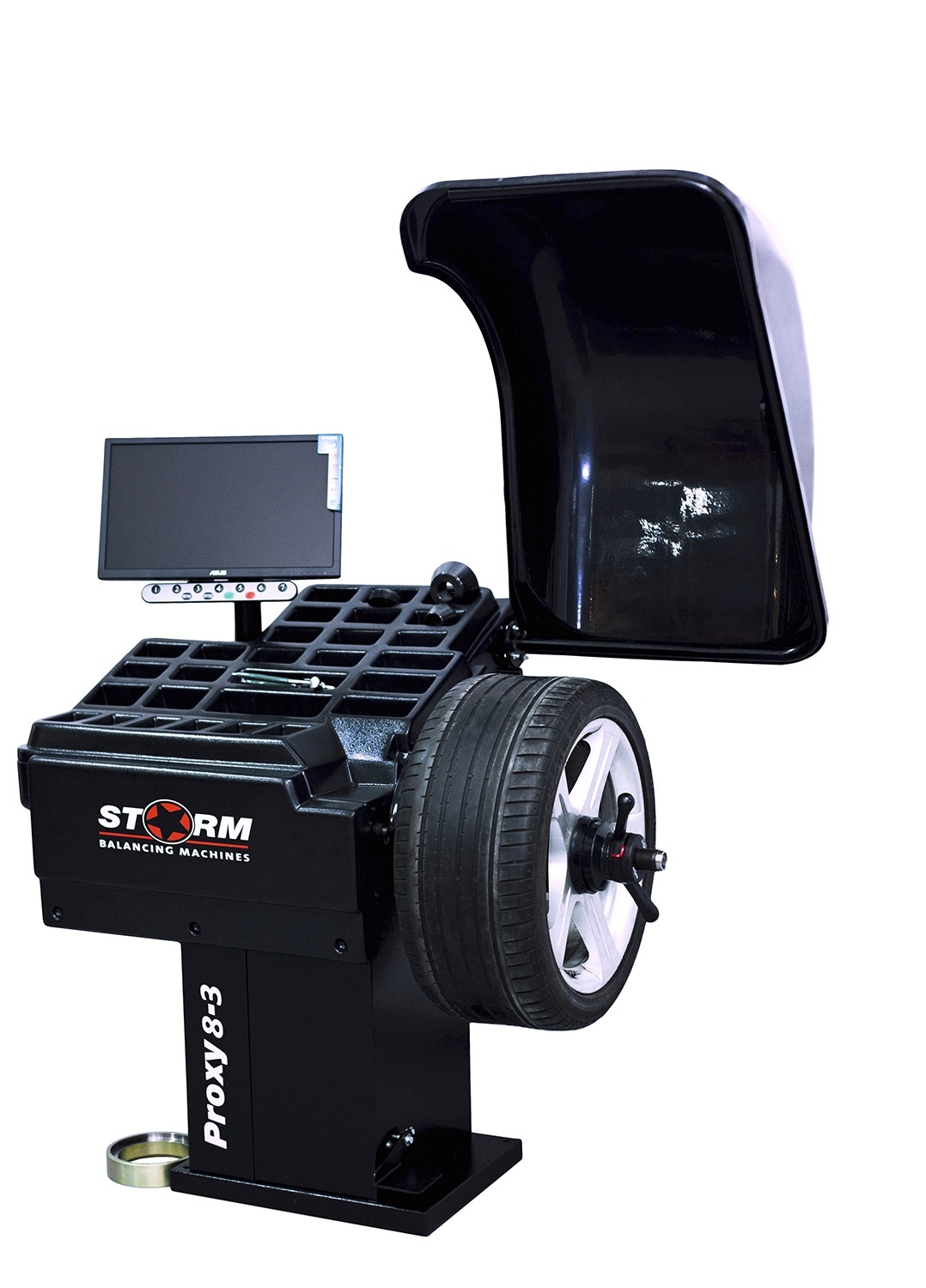 СТОРМ Proxy-8-3 – суперавтоматический станок виброконтроля и балансировки колес с микропроцессорным управлением и обработкой информации от российской компании "СТОРМ". Произведен и собран на заводе в Санкт-Петербурге. Станок балансировочный СТОРМ Proxy-8-3 - прецизионное (высокоточное) устройство, которое применяется для балансировки колес легковых автомобилей, микроавтобусов и легких грузовиков с диаметром диска до 30 дюймов и шириной до 20 дюймов. Является самым бюджетным из линейки балансировочных станков с виброконтролем. Отличается от станков с пневмоприжимом Proxy-8-2p и Proxy-8-2pi наличием функции автоматического закручивания прижимной гайки. Как и все балансировочное оборудование СТОРМ, сочетает в себе надежность и простоту использования, а также гарантию 24 месяца, в том числе на гайку и вал. Станок обеспечивает измерения статического (при свободном вращении) и динамического (при вращении на высокой скорости) дисбаланса колеса. Кроме того, СТОРМ Proxy-8-3 осуществляет вычисление масс корректирующих грузов и их положения в двух плоскостях коррекции (на наружной и внутренней сторонах диска колеса) за один цикл измерения. Преимущества балансировочного станка СТОРМ Proxy-8-3: Электрический прижим - автоматическое закручивание быстрозажимной гайки. Доворот - подвод к зоне или к точному месту установки груза. Обладает повышенной производительностью - до 160 отбалансированных колес в час. Является максимально быстрым балансировочным оборудованием - благодаря увеличенному расстоянию от корпуса до колеса, автоматическому зажиму колеса, подсветке диска, лазерной навигации, электромагнитному тормозу и ультразвуковому датчику. SVGA монитор с высококачественной 3D-графикой для отображения информации. Встроенная функция «3D-Disk» позволяет отображать на мониторе объемную проекцию колеса. Нагружает стенд диагностики колесных дисков работой в три раза выше обычного балансировочного станка. Полный цикл измерения колеса R14 - 5 секунд; колеса R20 - 8 секунд (разгон, измерение, торможение) Особенности балансировочного оборудования: Удлиненный вылет вала- обеспечивает возможность установки широких колес и удобный доступ к внутренней плоскости колеса для установки грузиков. Автоматическое закручивание прижимной гайки - осуществляется простым нажатием педали для закрепления колеса на валу. Точный подвод в место установки груза (следящий привод). Функция «AUTO-SONAR» - заменяет штангу измерения ширины колеса и делает возможным считывание параметров диска в автоматическом режиме при помощи ультразвукового датчика Функция автоматического определения вида корректирующего груза (самоклеящийся или набивной). Функция «AUTOSUPPLY» - режим автоматического приведения колеса в позиции установки корректирующих грузов. Функция «Лазерного наведения» в режиме «6 часов» - специальный лазер красного спектра указывает оператору, где следует чистить, обезжиривать и приклеивать самоклеящиеся грузы. Функция «AUTOPROGRAMM» позволяет автоматически задавать схему расположения балансировочных грузов для стальных и алюминиевых дисков. Станок сам выбирает необходимый режим и интеллектуально подстраивается под индивидуального оператора. Функция «AUTOSTICK» для точной установки клеящихся грузов с помощью рукоятки выдвижной штанги. Функция «Проверка биения диска» позволяет визуальн