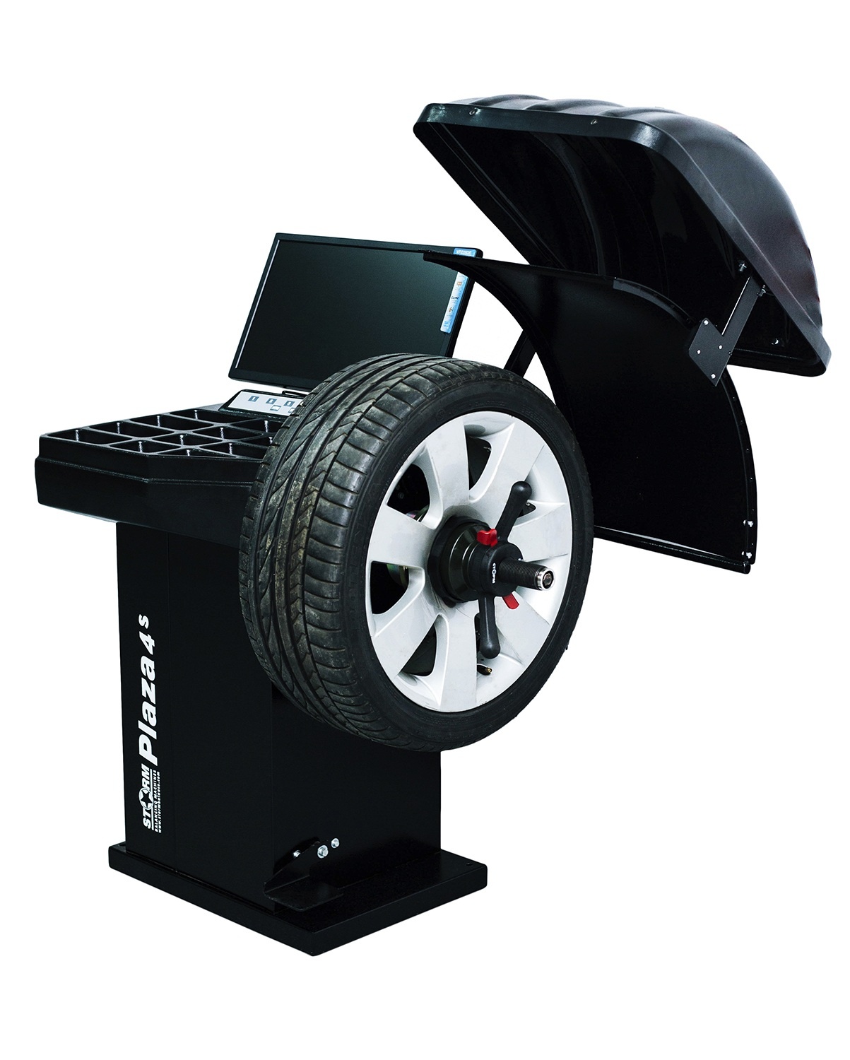 СТОРМ Plaza-4S – автоматический балансировочный станок от российской компании "СТОРМ". Произведен и собран на заводе в Санкт-Петербурге. Станок балансировочный СТОРМ Plaza-4S - прецизионное (высокоточное) устройство, которое применяется для балансировки колес легковых автомобилей, микроавтобусов и легких грузовиков с диаметром диска до 24 дюймов и шириной до 20 дюймов. Как и все балансировочное оборудование СТОРМ, сочетает в себе надежность и простоту использования, а также гарантию 24 месяца, в том числе на гайку и вал. Станок обеспечивает измерения статического (при свободном вращении) и динамического (при вращении на высокой скорости) дисбаланса колеса. Кроме того, СТОРМ Plaza-4S осуществляет вычисление масс корректирующих грузов и их положения в двух плоскостях коррекции (на наружной и внутренней сторонах диска колеса) за один цикл измерения. Отличие от модели Plaza-4 - наличие ультразвукового датчика для автоматического измерения ширины диска. Преимущества балансировочного станка СТОРМ Plaza-4S: Электрический прижим - автоматическое закручивание быстрозажимной гайки. Точный подвод в место установки груза (следящий привод). Многофункциональная педаль управления. Автомат с производительностью до 120 отбалансированных колес в час - самый быстрый в своем классе. Вычислительный блок построен на суперсовременном высокопроизводительном микропроцессоре фирмы Texas Instruments, предназначенном для индустриального применения. SVGA монитор с высококачественной 3D-графикой для отображения информации. Встроенная функция «3D-Disk» позволяет отображать на мониторе объемную проекцию колеса. Это дает возможность сразу чистить и обезжиривать места приклеивания балансировочных грузов, без дополнительных отметок. Максимально быстрая производительность благодаря автоматическому зажиму колеса, подсветке диска, лазерной навигации и электромагнитному тормозу. Особенности балансировочного оборудования: Автоматическое закручивание прижимной гайки простым нажатием педали упрощает крепление колеса на валу и при этом позволяет прилагать меньше физических усилий. Двухкоординатная измерительная линейка (выдвижная штанга) позволяет автоматически задавать дистанцию и диаметр в плоскостях, где будут устанавливаться балансировочные грузы. Программное обеспечение с функцией AUTOPROGRAMM самостоятельно задает схему расположения балансировочных грузов для стальных и алюминиевых дисков. На основе этих данных автоматически рассчитывается ширина. Подсветка осуществляется с помощью двух мощных светодиодов, расположенных на корпусе станка со стороны шпинделя. Лазерная навигация в режиме «6 часов» - указатель положения места установки для повышения точности установки клеящихся грузов. Программа «Split» используется при балансировке колес с высококачественными дисками из легких сплавов для сохранения внешнего вида колеса за счет установки невидимых снаружи корректирующих грузов за спицами диска. Программа «Opt» применяется для оптимального расположения шины на диске. Программа «Семь операторов» позволяет обслуживать одновременно несколько автомобилей с разными типами и размерами колес. Переход от одного размера колеса к другому обеспечивается путём переключения операторов. Функция «MEMORY» позволяет вести статистику работы станка (количество запусков, количе
