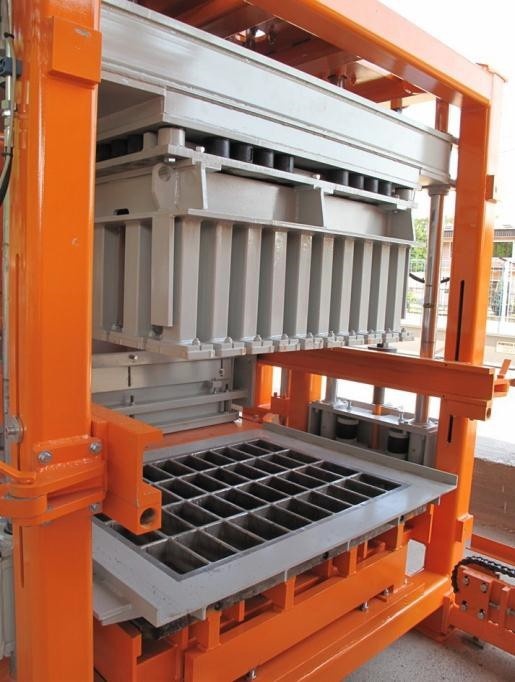 Устройство для перемещения готовых бетонных блоков из блок-машины с регулированием скорости старта/остановки рампы, состоит из двух цепных транспортных систем.