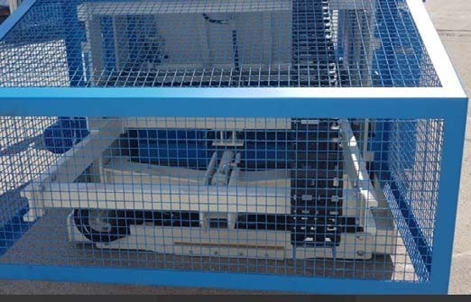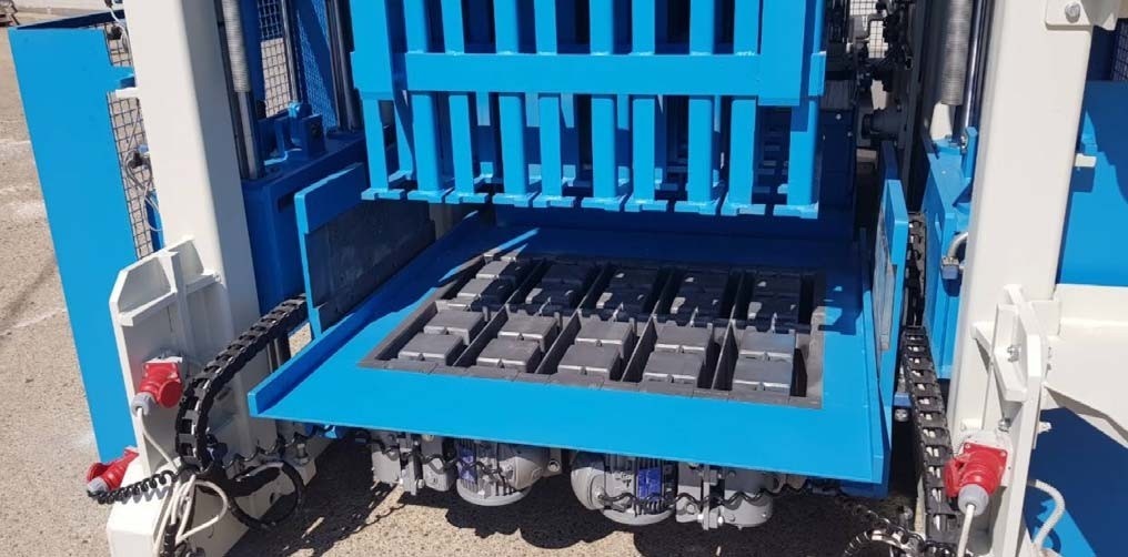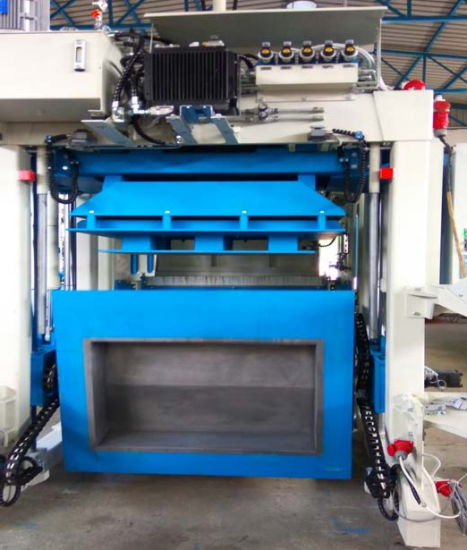 Тяжелая конструкция основной рамы машины, построенна из квадратных труб. Система пресс- формы и трамбовочной головки работает гидравлически в системе хромированных направляющих колонн (2 направляющих). Система пресс-формы прикреплена к направляющим колонкам. Два нижних гидравлических цилиндра, прикрепленных к жесткому стальному синхронизирующему валу, приводят в движение. Трамбовочная головка ориентирована на 4 направляющих колонны и оснащена легко заменяемыми втулками. Приводится в действие прямым гидравлическим цилиндром, который управляет ходом трамбовочной головки.