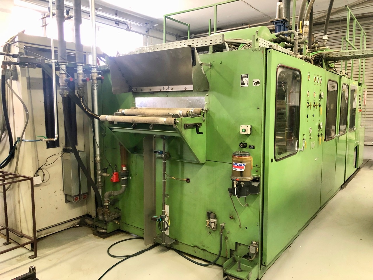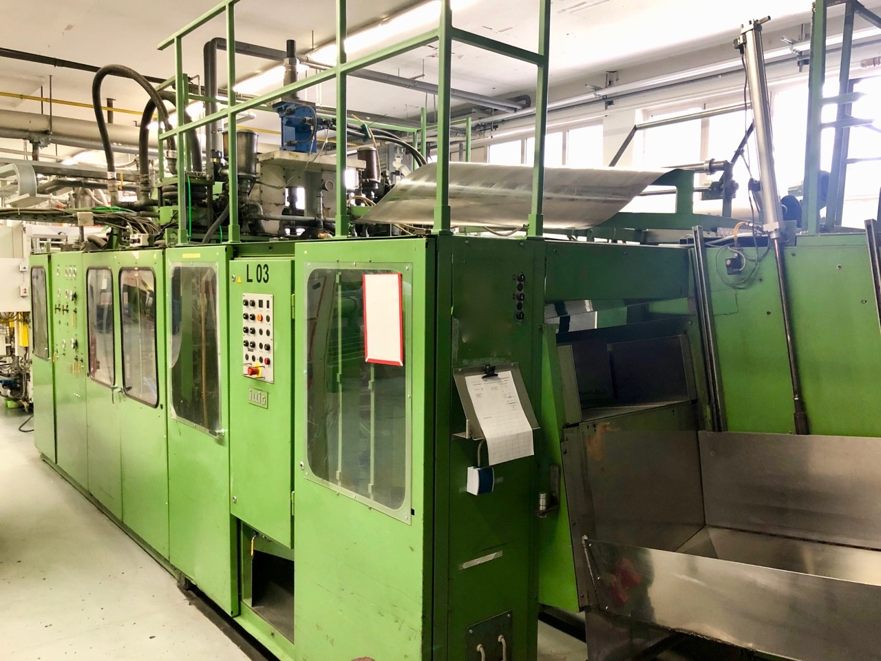 | Технические характеристики: Площадь формования max.: 750x400 мм Ширина ленты max. : 730 мм Толщина материала max.: 0,5-2 мм Длинна протяжки max.: 300 мм Глубина вытяжки : 140 мм Давление формующего воздуха : 6 бар Кол-во циклов сухих циклов.: 30 Часы наработки: 33 623 часа Комплектация: -Преднагрев -Дробилка -Пресс-форма под 95 стакан -Экструзионная линия Battenfeld Для этой машины , наша компания предлагает 2 пакета услуг, которые предоставляются , по желанию клиента! 1 Вариант капитального ремонта -Замена цепей -Замена всех подшипников -Замена пневматики -Ремонт силовой части управления -Замена контроллера -Запуск машины на вашей территории Срок выполнения работ: 3 месяца Гарантия 1 год 2 Вариант капитального ремонта -Капитальный ремонт и модернизация -Замена цепей -Замена всех подшипников -Замена пневматики -Ремонт силовой части управления -Замена контроллера -Замена привода пуансона, толкателей и штабелера на сервомоторы (это обеспечит увеличения скорости) -Запуск машины на вашей территории Срок выполнения работ: 5 месяца Гарантия 1 год _____________________ Формовка, термоформовка, формовка пластиков, формовка полимеров, вакуумная формовка, вакуумная формовка пластиков, полимерное оборудование, оборудование для полимеров, пластика формовка, вакуумный формовочный станок, станок формовки, формовочный станок, купить формовку, купить термоформовку, купить ILLIG RDK 80. преформы, пресс-формы | ||