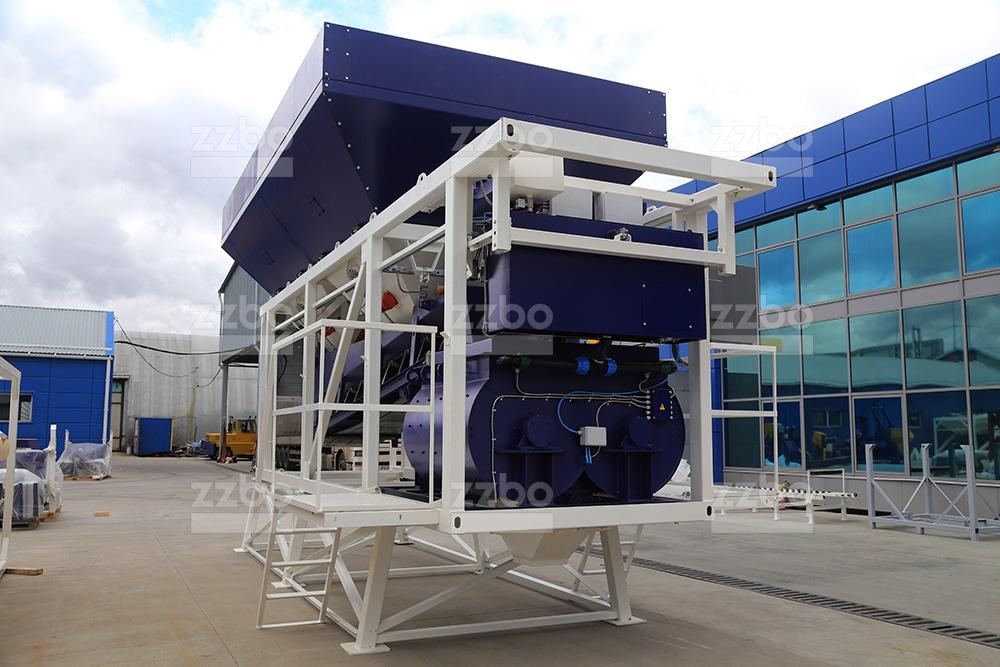 Объем 750 литров. Бетоносмеситель принудительного типа, двухвальный. С горизонтальным расположением валов. Общее количество лопастей — 14. Мощность привода смесителя 11 кВт. Вращение валов с частотой 36 оборотов в минуту.