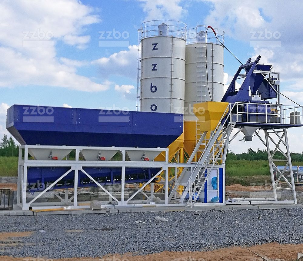Двухвальный бетоносмеситель БП-2Г-2250с установлен на эстакаде с высотой выгрузки готовой смеси 4 метра. Бетоносмеситель оснащен скипом с донным затвором для подъема и загрузки смеси.