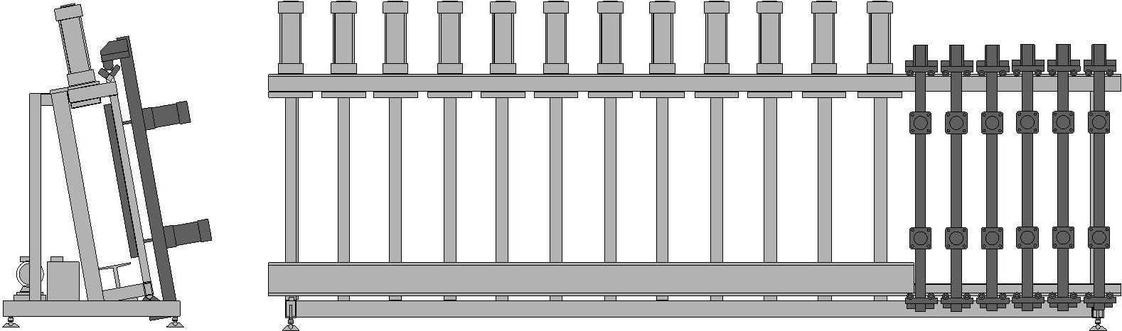 Прижимные башмаки, усиленные ребрами жесткости, имеют площадки с большой площадью - 155х460 и 255х460 мм, равномерно распределяющие нагрузку каждого гидроцилиндра на поверхность заготовок. Промежутки между площадками 80 мм.
