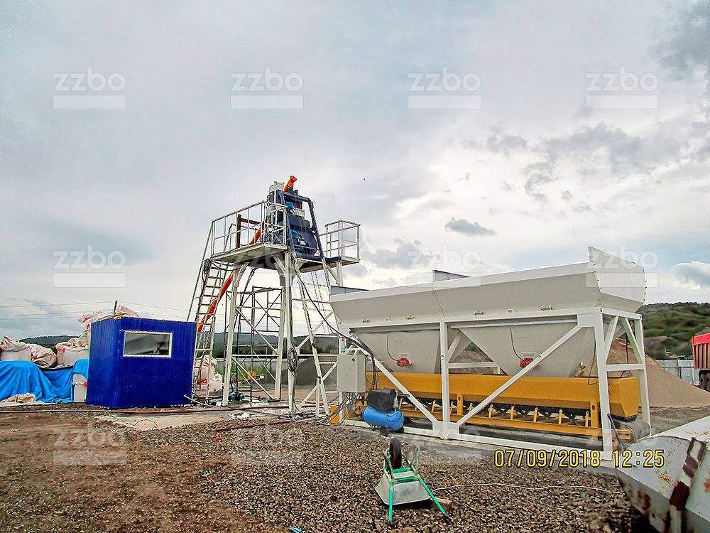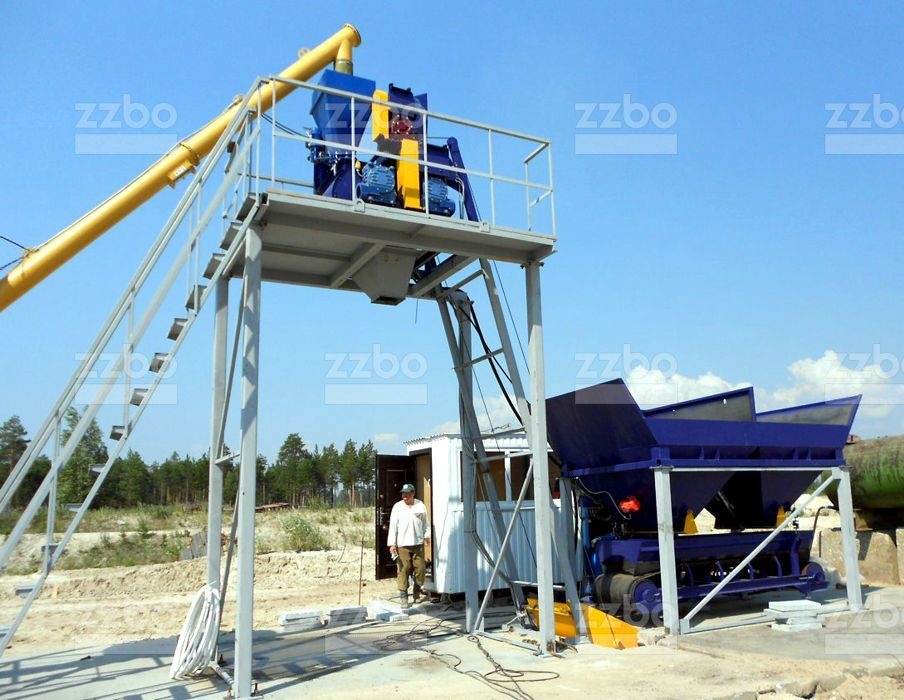 Двухвальный бетоносмеситель БП-2Г-375с установлен на эстакаде с высотой разгрузки готовой смеси 4 метра. Бетоносмеситель оборудован специальным ковшом (скипом) для подъема и загрузки компонентов смеси внутрь бетоносмесителя.