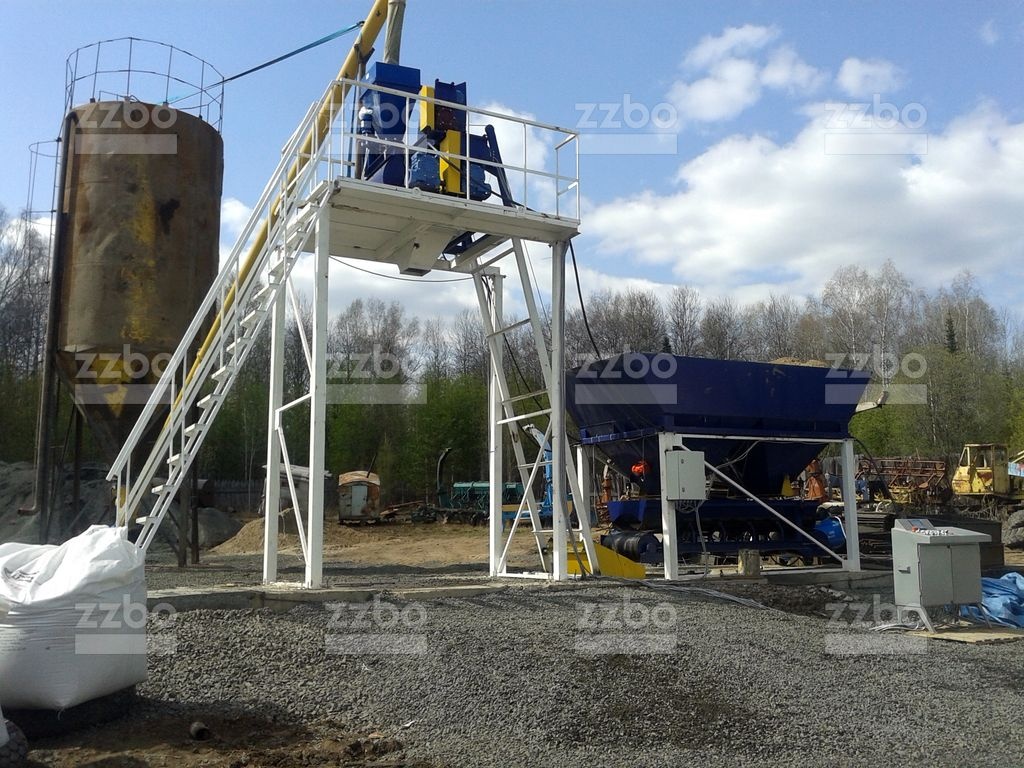 Двухвальный бетоносмеситель БП-2Г-375с установлен на эстакаде с высотой разгрузки готовой смеси 4 метра. Бетоносмеситель оборудован специальным ковшом (скипом) для подъема и загрузки компонентов смеси внутрь бетоносмесителя.