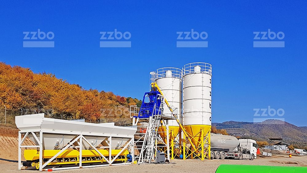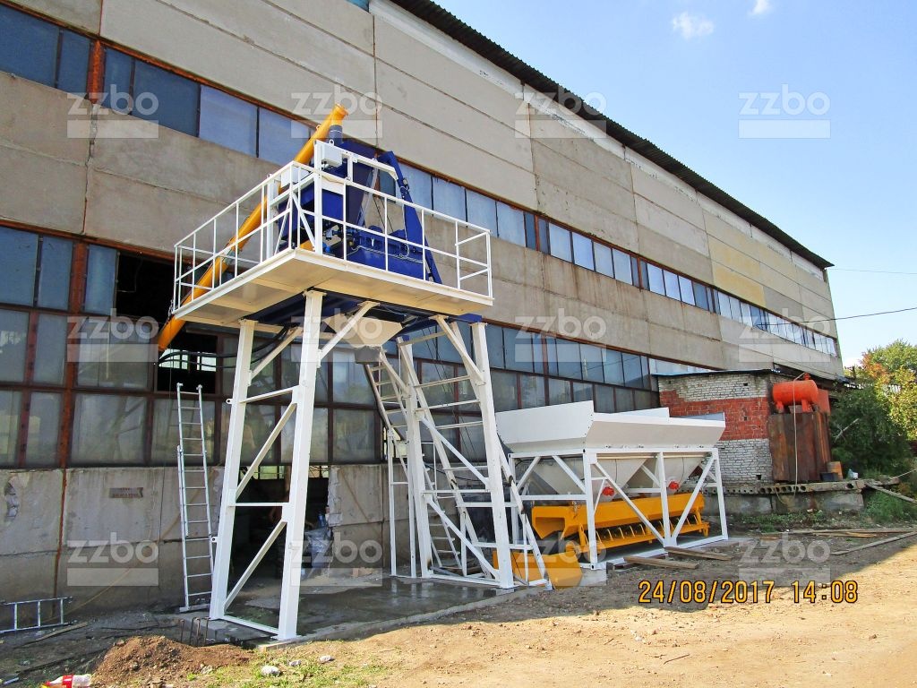 Двухвальный бетоносмеситель БП-2Г-750с установлен на эстакаде, на высоте разгрузки готовой смеси 4 метра. Бетоносмеситель оборудован специальным ковшом (скипом) для подъема и загрузки компонентов смеси внутрь бетоносмесителя. Скип имеет донный затвор, для уменьшения запыления и увеличения скорости разгрузки.