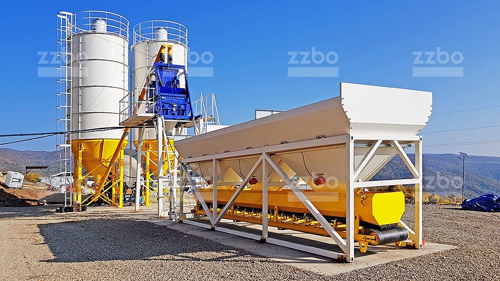 Двухвальный бетоносмеситель БП-2Г-750с установлен на эстакаде, на высоте разгрузки готовой смеси 4 метра. Бетоносмеситель оборудован специальным ковшом (скипом) для подъема и загрузки компонентов смеси внутрь бетоносмесителя. Скип имеет донный затвор, для уменьшения запыления и увеличения скорости разгрузки.