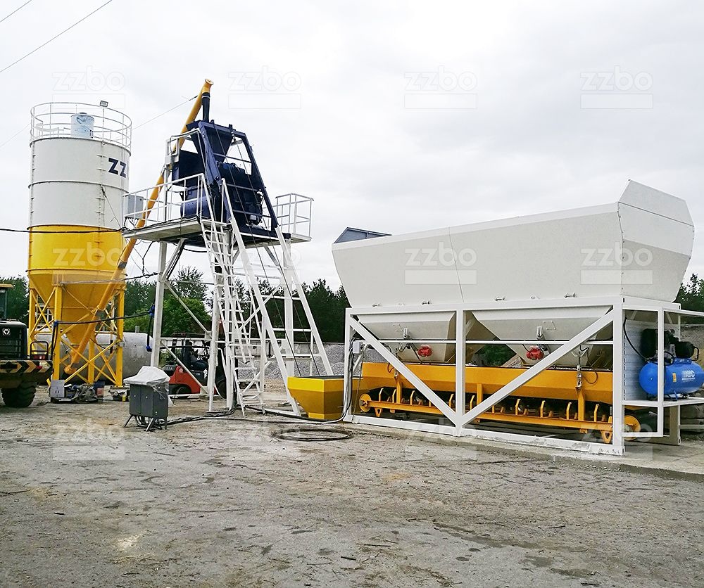 Двухвальный бетоносмеситель БП-2Г-1200с установлен на эстакаде, на высоте разгрузки готовой смеси 4 метра. Бетоносмеситель оборудован специальным ковшом (скипом) для подъема и загрузки компонентов смеси внутрь бетоносмесителя. Скип имеет донный затвор, для уменьшения запыления и увеличения скорости разгрузки.