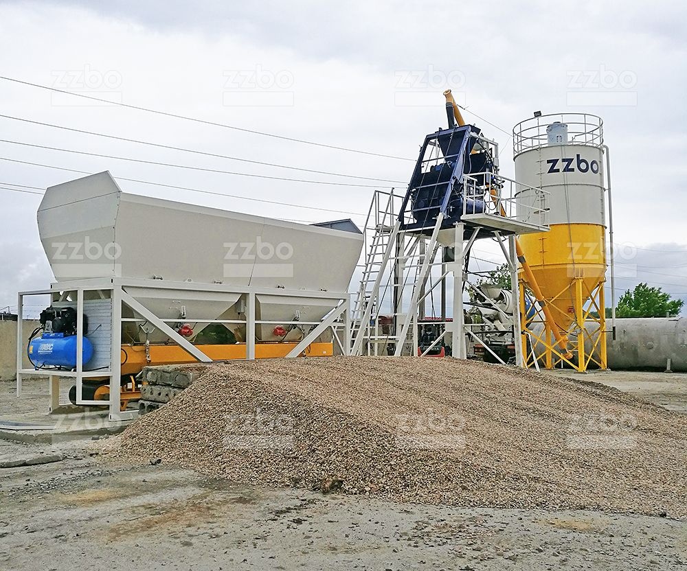 Двухвальный бетоносмеситель БП-2Г-1200с установлен на эстакаде, на высоте разгрузки готовой смеси 4 метра. Бетоносмеситель оборудован специальным ковшом (скипом) для подъема и загрузки компонентов смеси внутрь бетоносмесителя. Скип имеет донный затвор, для уменьшения запыления и увеличения скорости разгрузки.