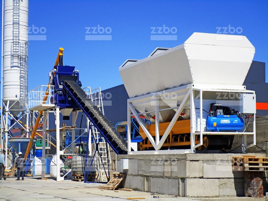 Двухвальный бетоносмеситель БП-2Г-750 установлен на эстакаде, на высоте разгрузки готовой смеси 4 метра. Бетонный завод оборудован специальным ленточным конвейером с шевронной лентой для загрузки инертных материалов в двухвальный бетоносмеситель бетоносмеситель.