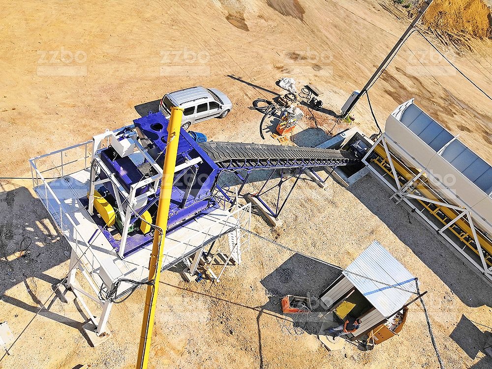 Двухвальный бетоносмеситель БП-2Г-1200 установлен на эстакаде, на высоте разгрузки готовой смеси 4 метра. Бетонный завод оборудован специальным ленточным конвейером с шевронной лентой для загрузки инертных материалов в двухвальный бетоносмеситель.