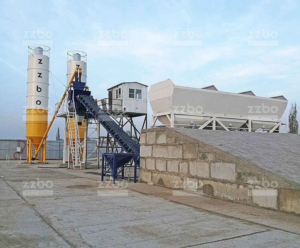 Двухвальный бетоносмеситель БП-2Г-1200 установлен на эстакаде, на высоте разгрузки готовой смеси 4 метра. Бетонный завод оборудован специальным ленточным конвейером с шевронной лентой для загрузки инертных материалов в двухвальный бетоносмеситель.