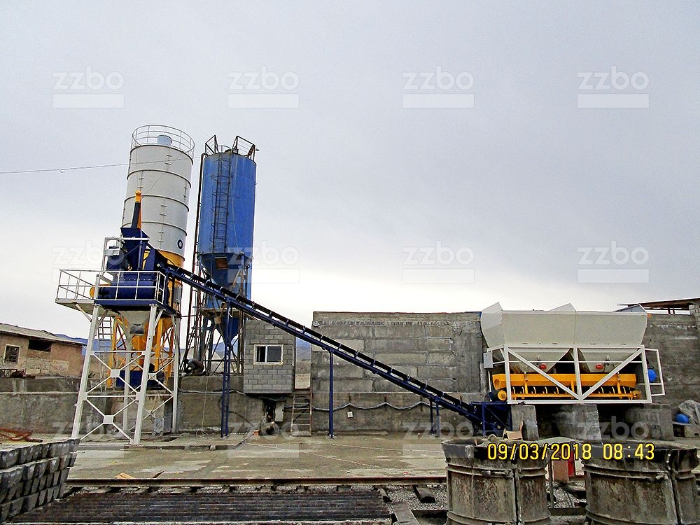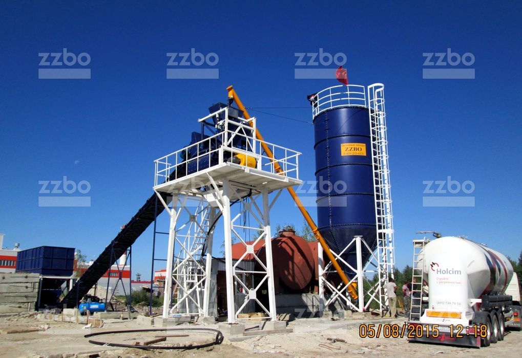 Двухвальный бетоносмеситель БП-2Г-1500 установлен на эстакаде, на высоте разгрузки готовой смеси 4 метра. Бетоносмеситель оборудован специальным ленточным конвейером для загрузки инертных материалов в бетоносмеситель.