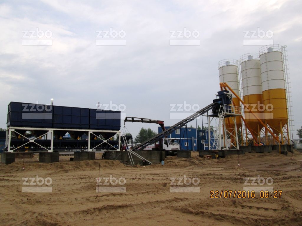 Двухвальный бетоносмеситель БП-2Г-2250 установлен на эстакаде, на высоте разгрузки готовой смеси 4 метра. Бетоносмеситель оборудован специальным ленточным конвейером для загрузки инертных материалов в бетоносмеситель.