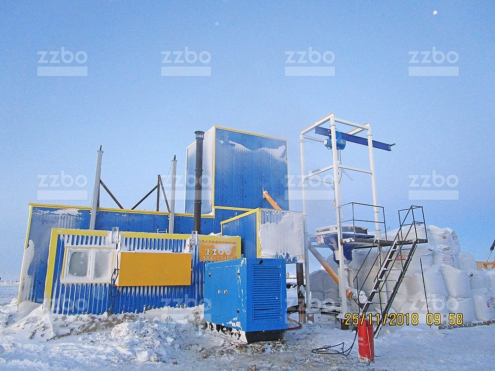 Бетонный завод и утепленный корпус смонтирован на раме, которая устанавливается на ровной площадке, без использования фундамента, при этом скиповый приямок не нужен.
