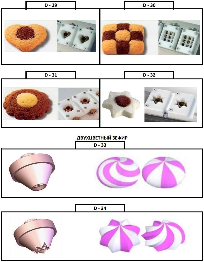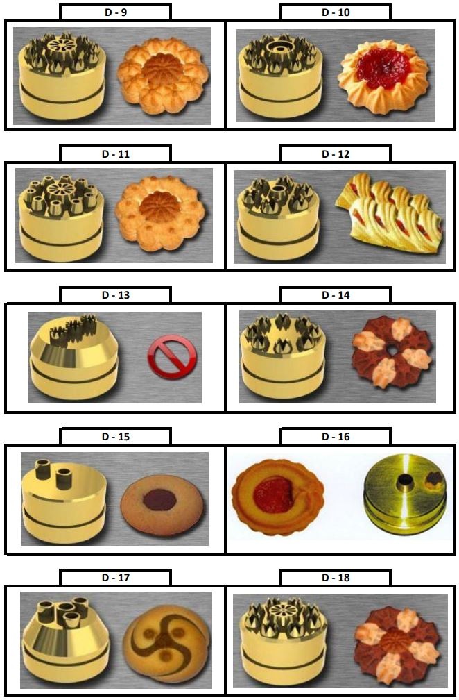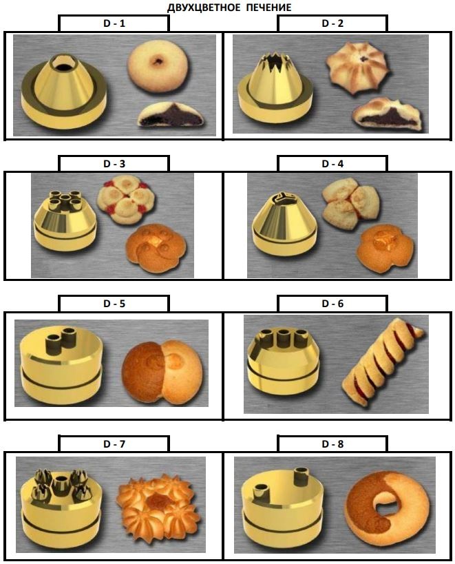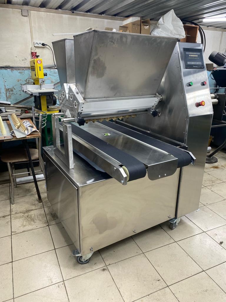 Машина для печенья – это машина, используемая в производстве широкого ассортимента печенья. Машина позволяет производить экструзию через отверстия различной формы (насадки) предварительно заготовленного теста и начинки, придавая печенью различные формы путем перемещения противня и вращения насадок.